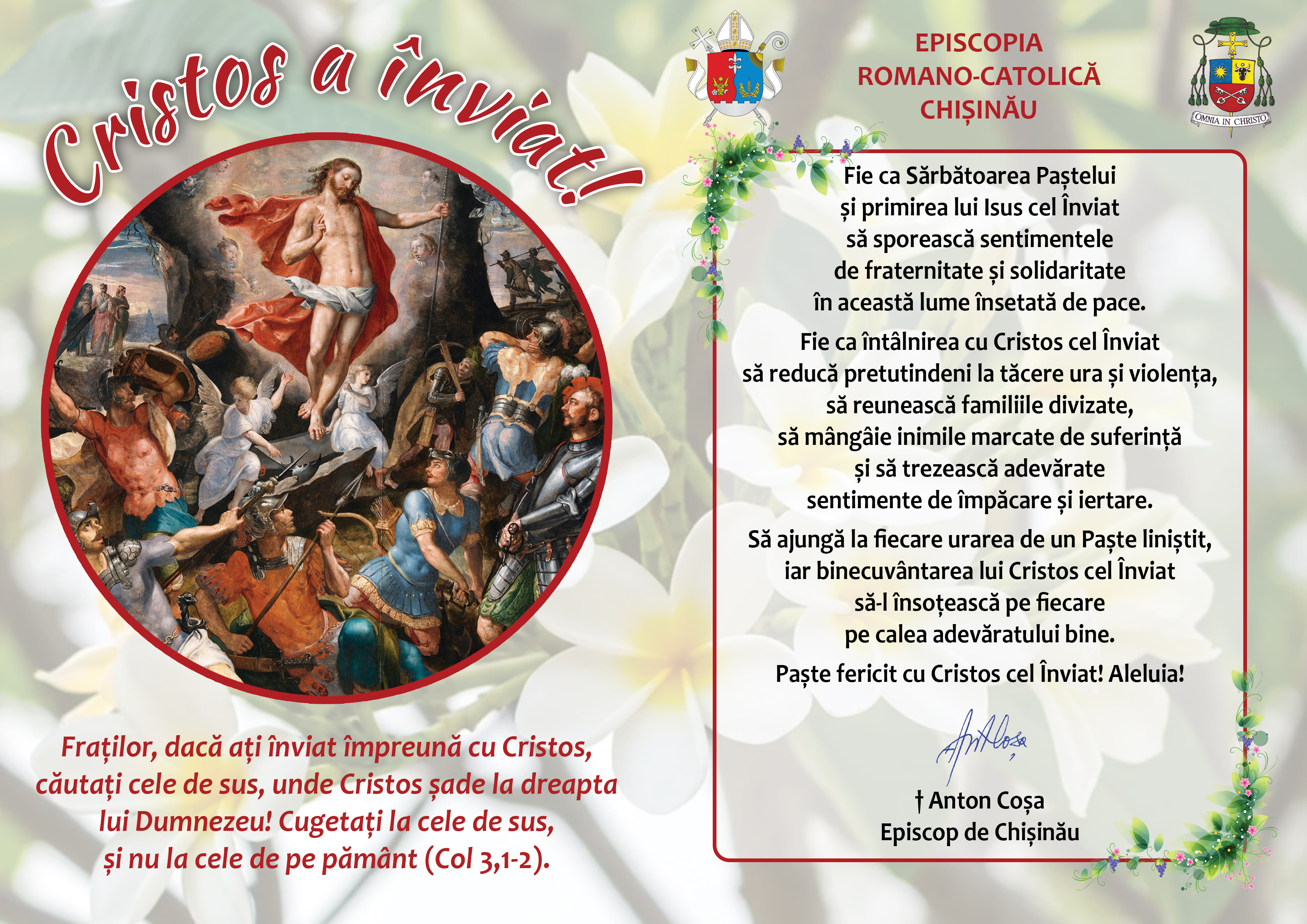 Vă doresc din inimă multă pace și bună înțelegere cu Dumnezeu și cu oamenii și fie ca sărbătoarea Paștelui să vă aducă bucurie și lumină, pentru a fi în lume „făcători de pace”.