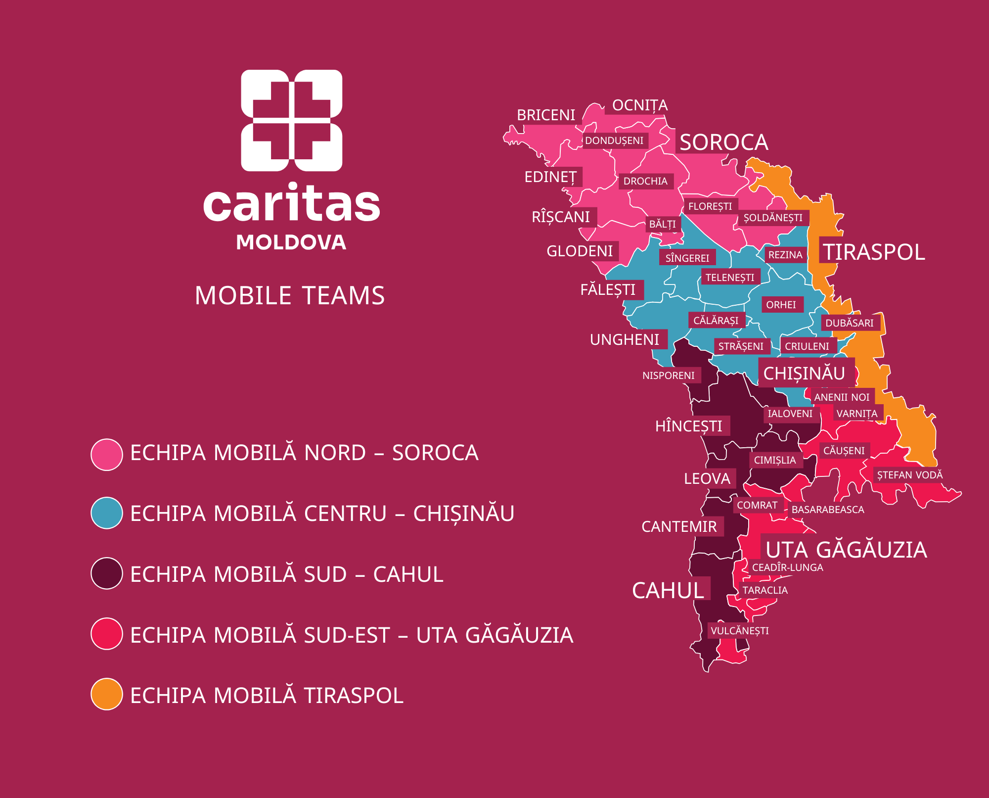 Мобильные команды Caritas Moldova являются частью проекта, но представляют собой гибкий механизм гуманитарного вмешательства, обеспечивающий доступ к основным услугам в сельских, изолированных или имеющих ограниченный доступ к услугам сообществах. Пять мобильных команд предоставляют комплексную поддержку: защиту, социальную и психологическую поддержку, распределение помощи и ваучеров (на продукты питания, гигиену, лекарства, одежду), а также информацию о правах и доступных услугах.
